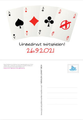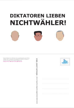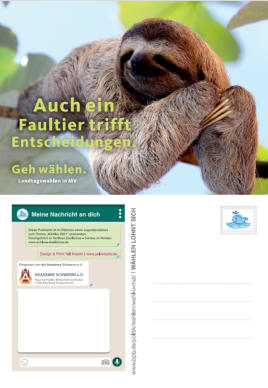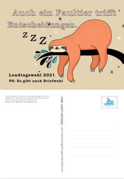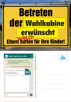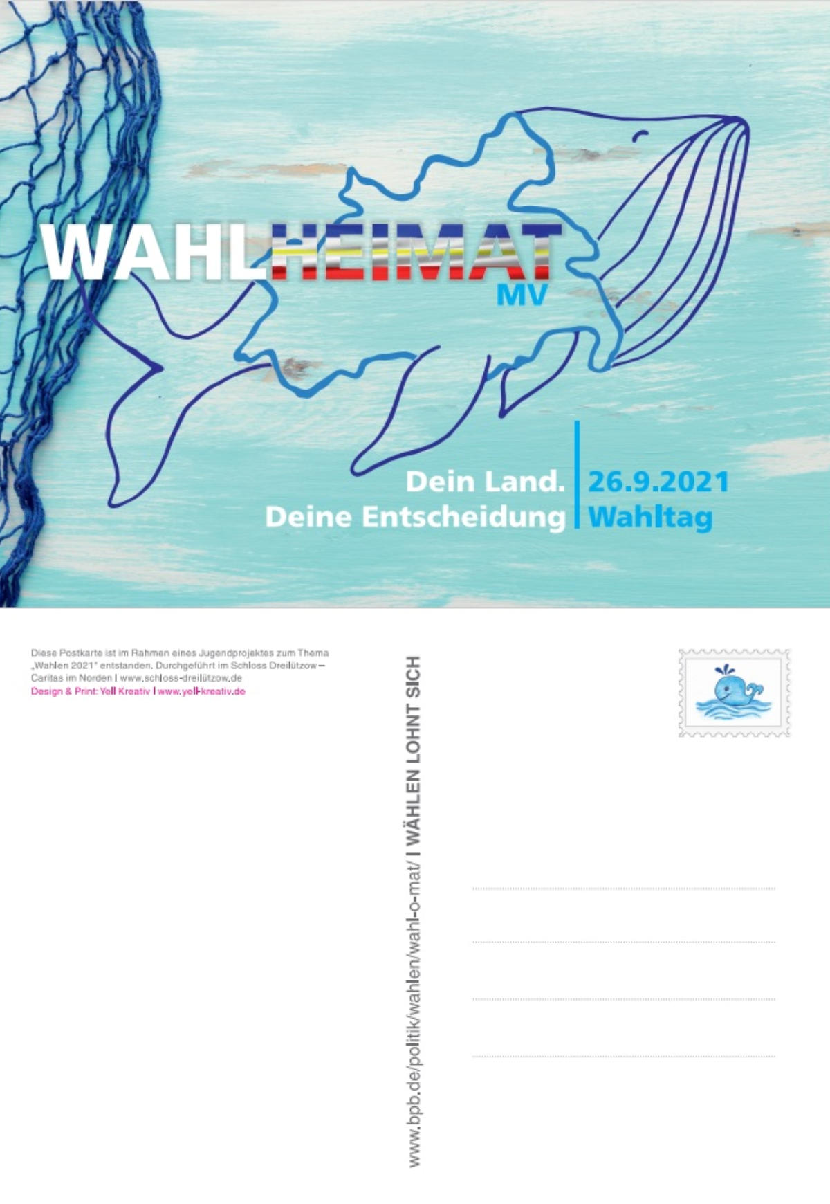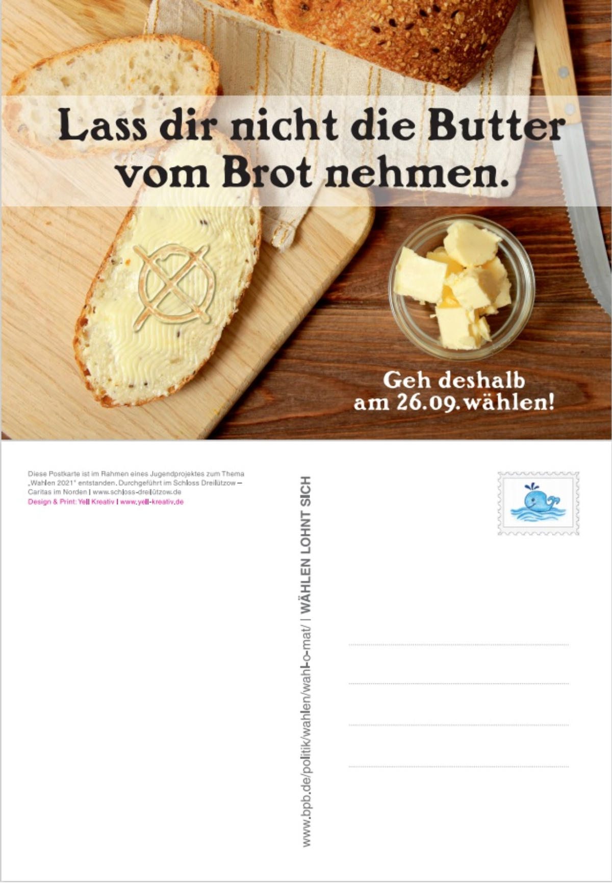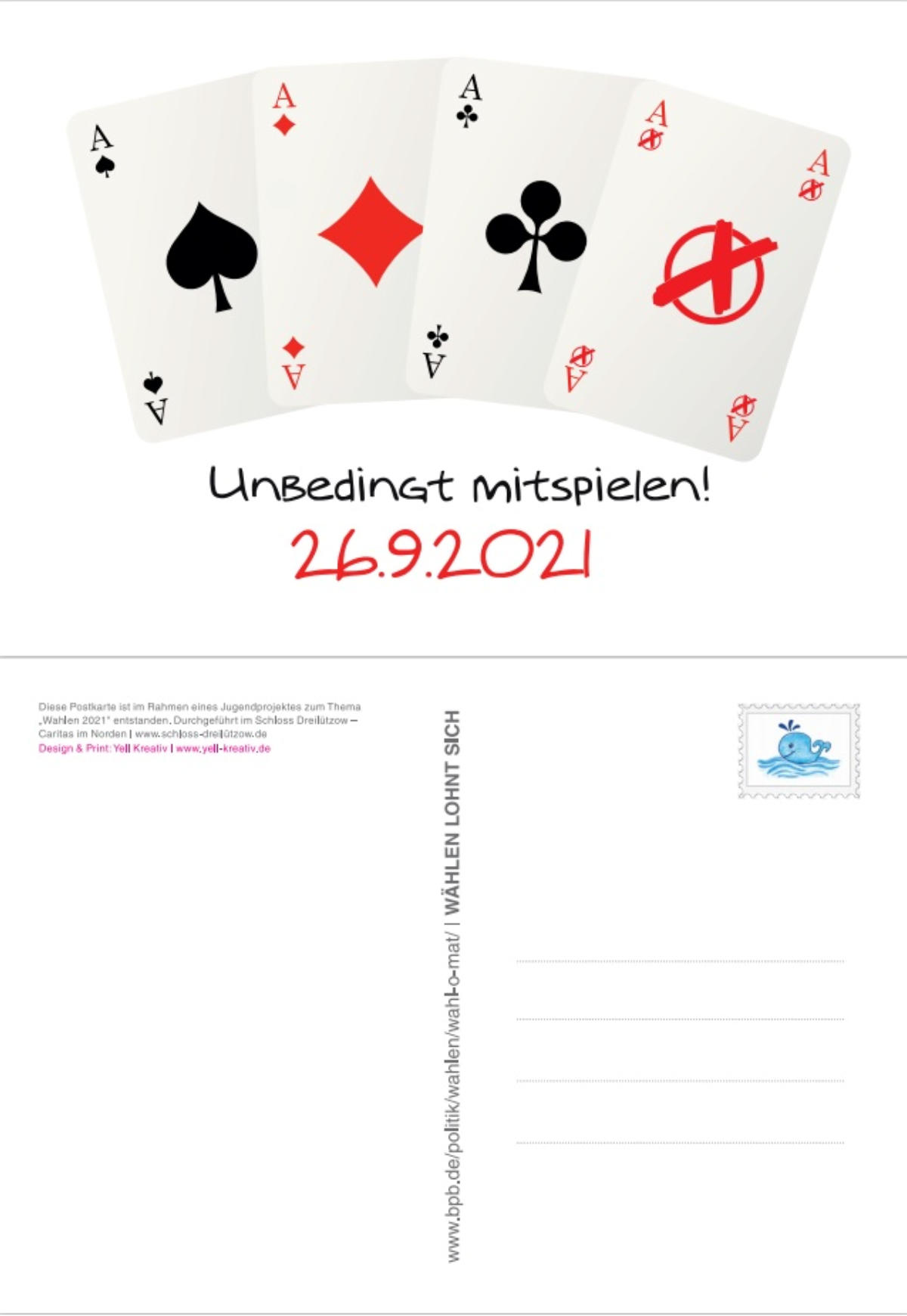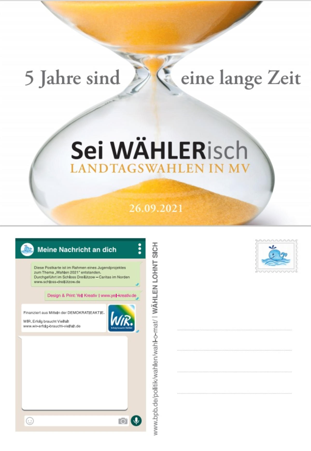 Wahlen 2021Seit Jahren ist die Wahlbeteiligung niedrig. Um diese zu erhöhen haben sich jugendliche Mitarbeitende Gedanken gemacht, wie auf witzige Weise auf die Wahl hingewiesen werden kann. Diese Postkarten sind im Rahmen von Freiwilligendiensten im Schloss Dreilützow entstanden.