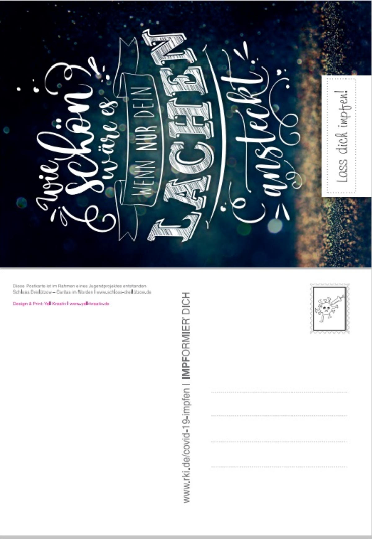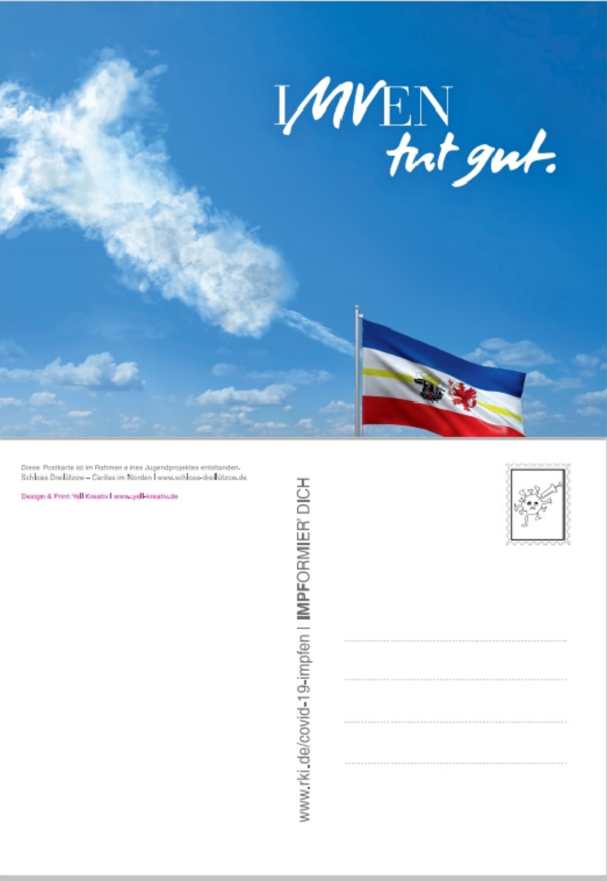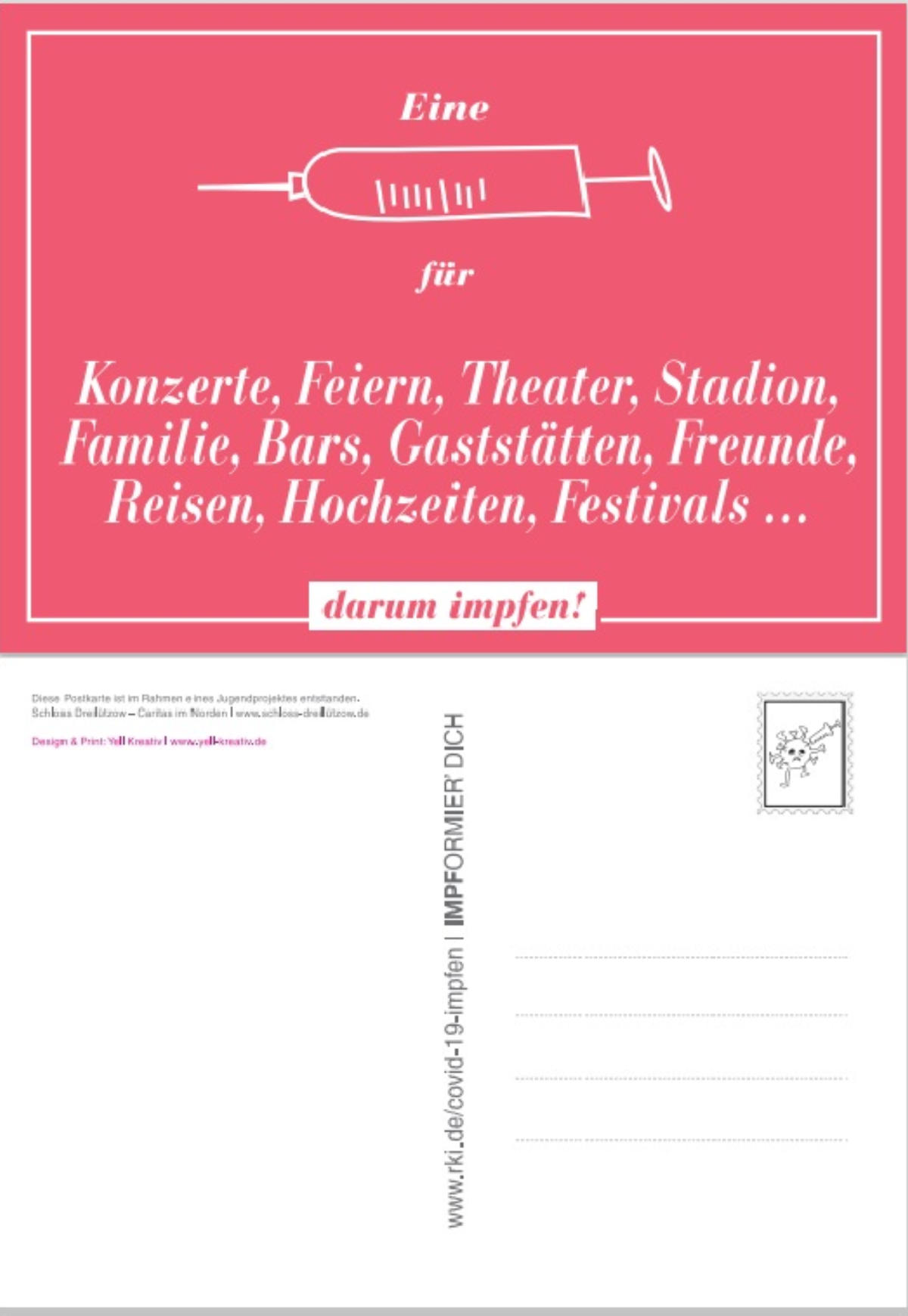 Impfen 2021Du kannst helfen viele Leben zu schützen und einen schnelleren Neustart für Gastronomie und Beherbergung zu ermöglichen.Diese Postkarten sind im Rahmen von Freiwilligendiensten im Schloss Dreilützow entstanden