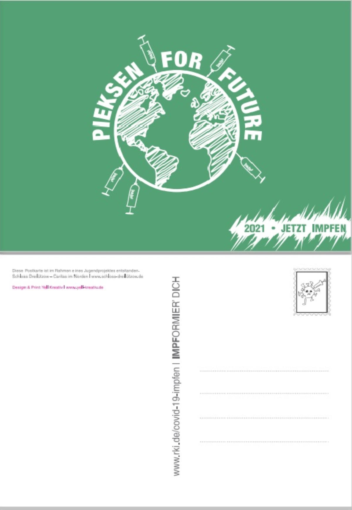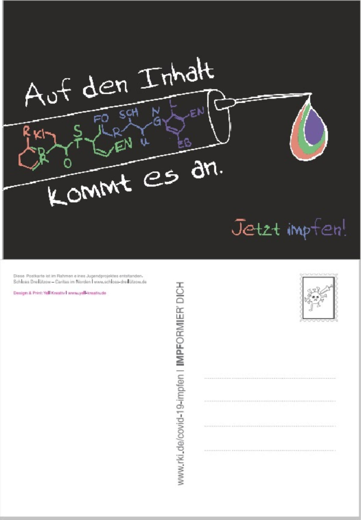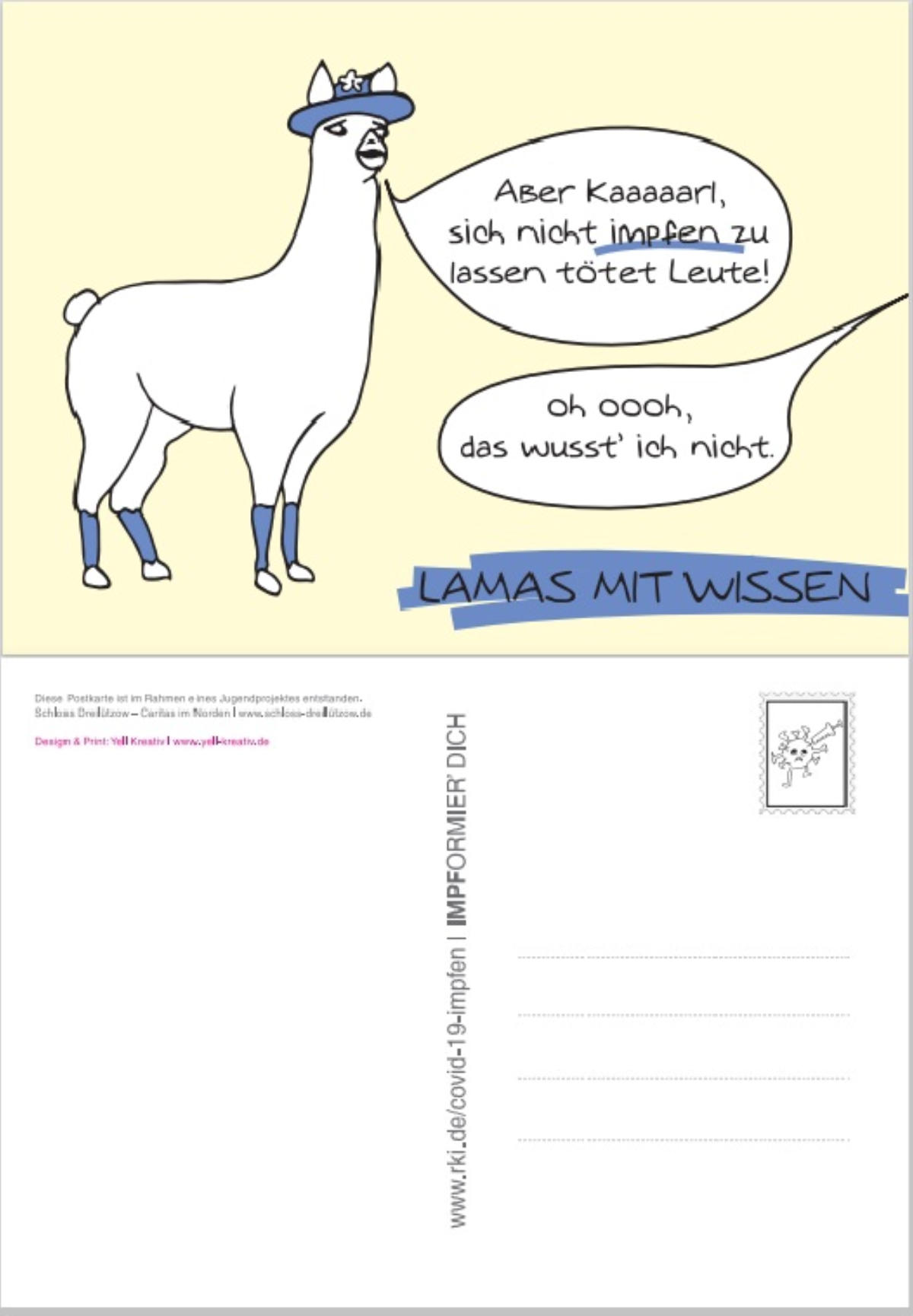 Impfen 2021Du kannst helfen viele Leben zu schützen und einen schnelleren Neustart für Gastronomie und Beherbergung zu ermöglichen.Diese Postkarten sind im Rahmen von Freiwilligendiensten im Schloss Dreilützow entstanden