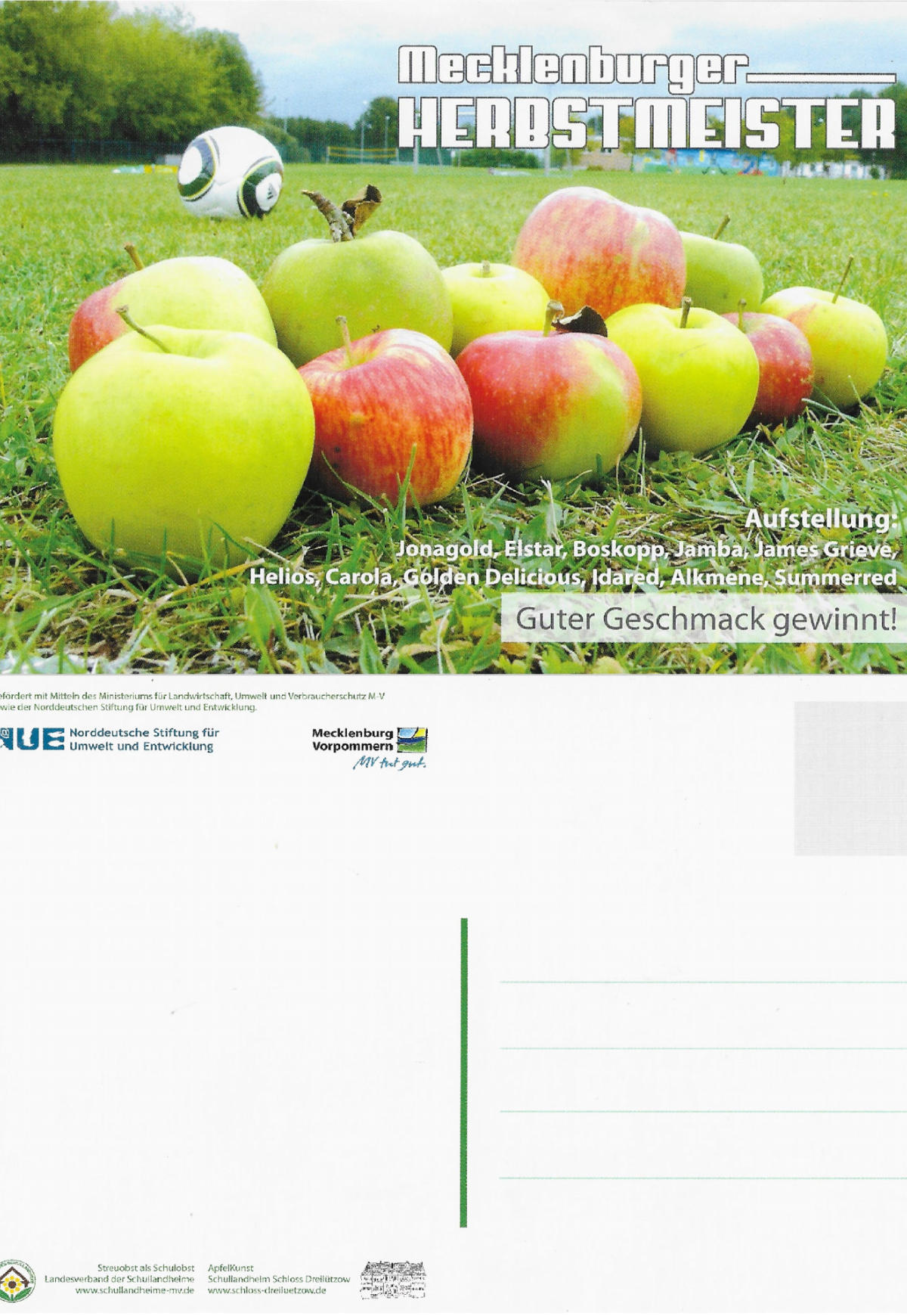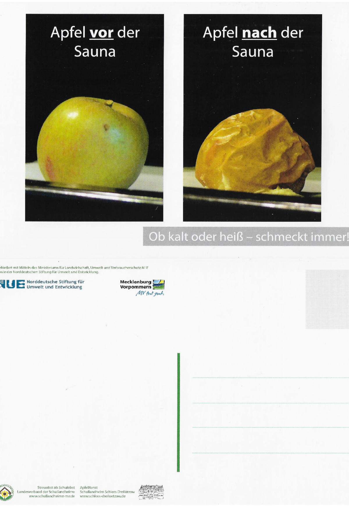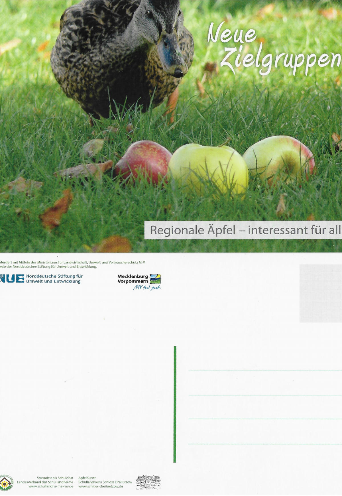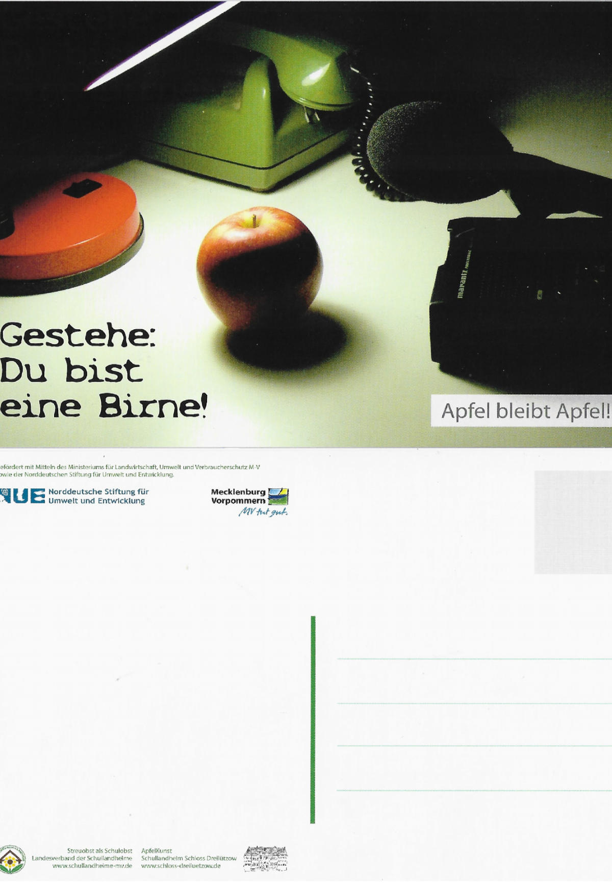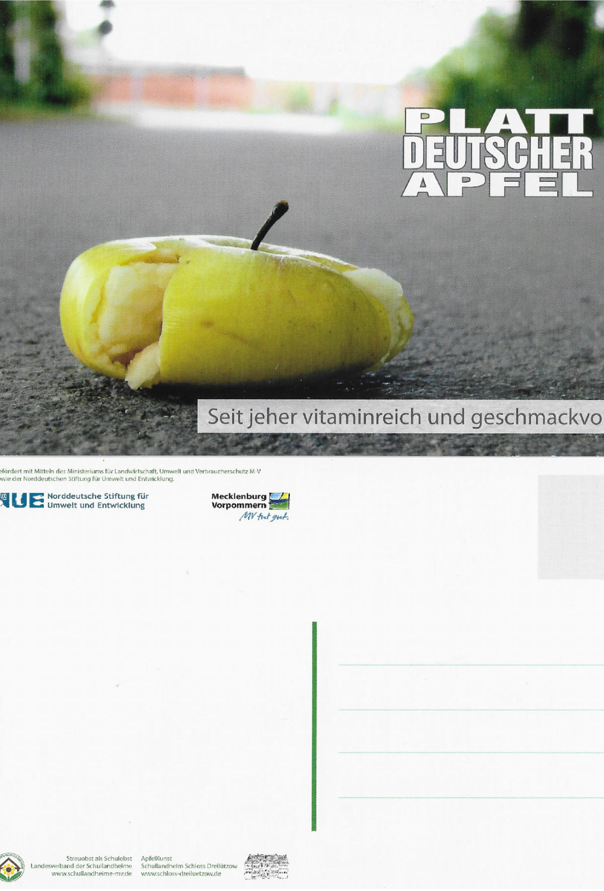 ApfelprojektIm Alltag machen wir uns kaum darum gedanken. Die meisten unserer Äpfel im Supermarkt kommen von weit her, während einheimische Sorten leiden und jedes Jahr sogar aussterben. Diese Postkarten sind von Jugendlichen im Freiwiliigendienstes im Schullandheim Schloss Dreilützow im Rahmen des Projektes Streuobstwiesen des Landesverbandes der Schullandheime MV entstanden.